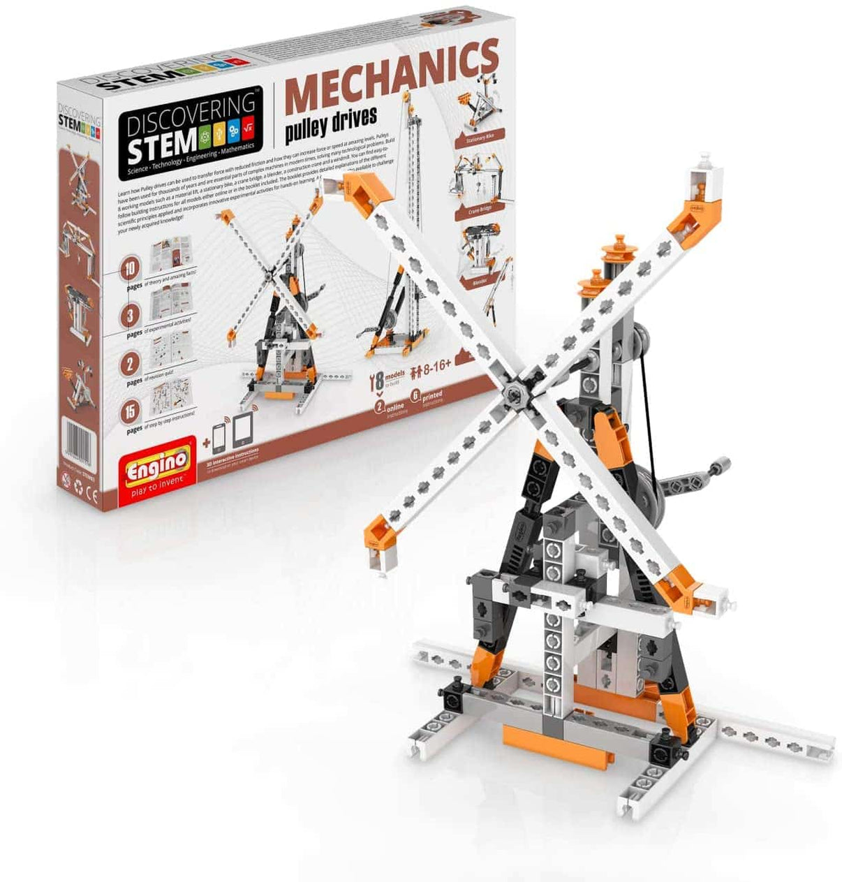 Engino for ages 8 and up. With Engino' s MECHANICS: Pulley Drives set learn how pulley drives can be used to transfer force with reduced friction and how they can increase force or speed at amazing levels. Pulleys have been used for thousands of years and are essential parts of complex machines in modern times, solving many technological problems. Build 8 working models such as a material lift, a stationary bike, a crane bridge, a blender, a construction crane and a windmill. You can find easy-to-follow building instructions for all models either online or in the booklet included. The booklet provides detailed explanations of the different scientific principles applied and incorporates innovative experimental activities for hands-on learning.