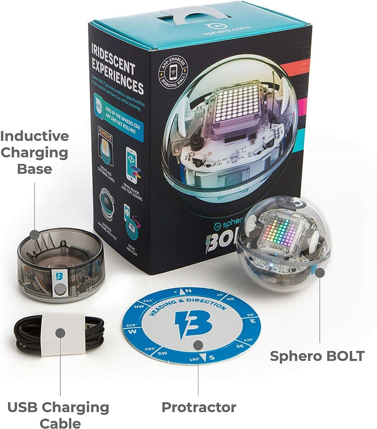 Sphero BOLT is an app-enabled robotic ball that provides endless opportunities to be creative and have fun while learning. Program with the Sphero Edu app from nearly any mobile or desktop device, discover awesome community-created activities, or just drive and play. BOLT was built to shine with a brilliant 8x8 LED Matrix that animates and displays real-time data. Create and customize games and learn to code by drawing on your screen, using Scratch™ blocks, or writing JavaScript text programs.