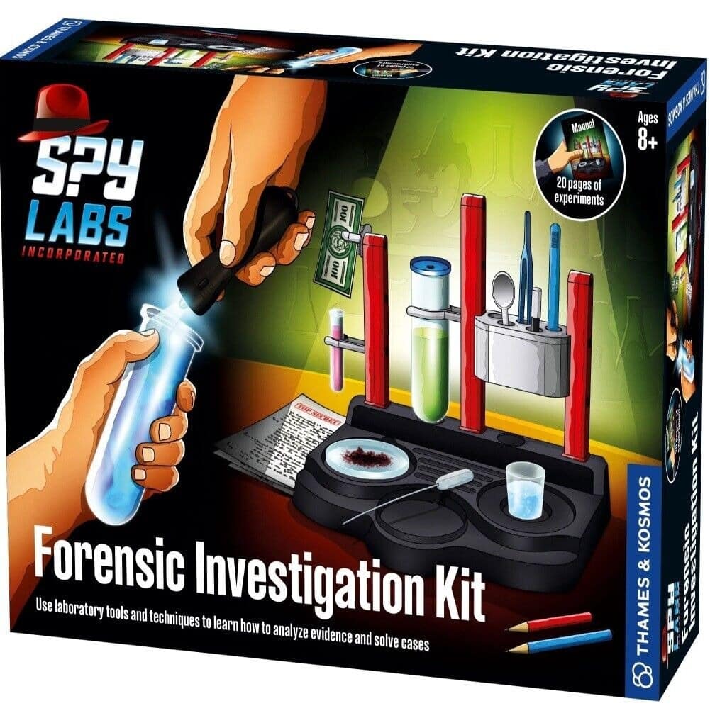 Using the Forensic Investigation kit assume the role of a forensic scientist to find out! Perform experiments on evidence in this large laboratory station using chemical and physical techniques. Analyse solids and liquids, make a fluorescent solution, inspect invisible ink, lift fingerprints, look for counterfeit notes, and examine ink using chromatography. The experiments are accompanied by exciting stories of make-believe mysteries and crimes to solve.