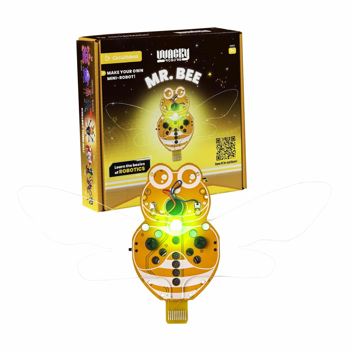 Mr. Bee, a DIY Wacky Robot that will introduce you to the exciting world of robotics and STEM. With Mr. Bee, you'll learn about different electronic components, vibration motors, and resistance.