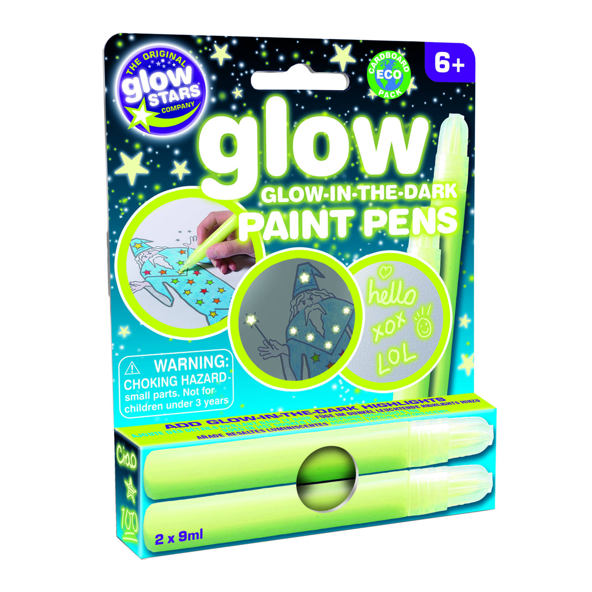Create your own glow-in-the-dark masterpieces with these easy-to-use Glow-in-the-Dark Paint Pens from The Original Glowstars Company. This pack includes two 9ml pens, perfect for adding a magical, glowing touch to drawings, stickers, posters, and books.