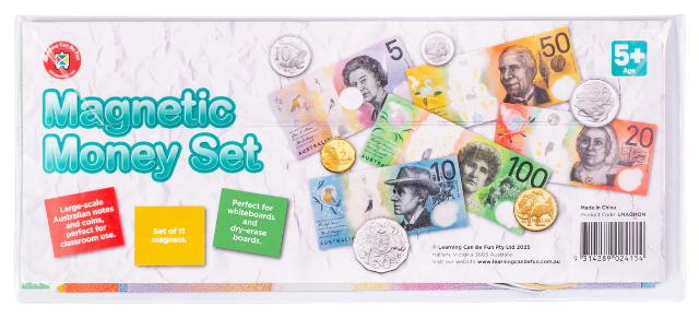 Learning Can Be Fun - Magnetic Money Coins & Notes Teach Australian currency with confidence using these oversized magnetic money coins and notes. Each piece is enlarged over 3 times...